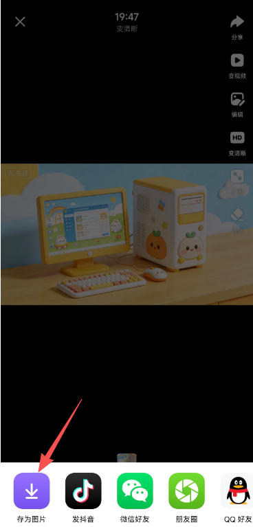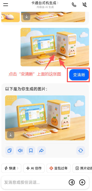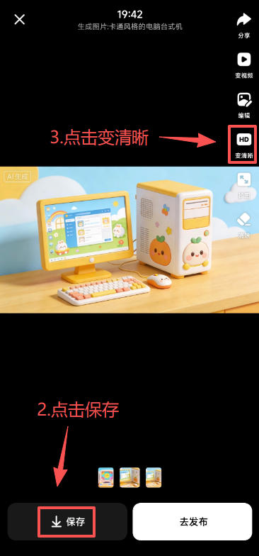 点击下方的“保存”按钮,将含有“豆包AI生成”水印的图片保存至相册,然后点击右侧“变清晰”按钮(如图所示)。